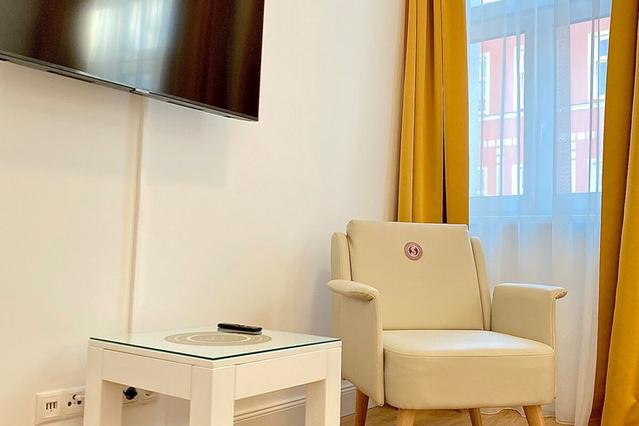 This brand-new apartment is airy and spacious, it has high ceilings and all the comforts.